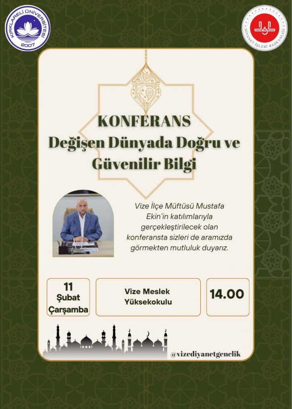 Vize İlçe Müftüsü Mustafa Ekin'in katılımıyla gerçekleştirilecek konferansa tüm öğrencilerimiz davetlidir.