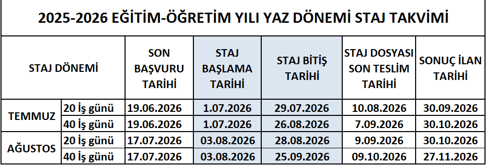 2025-2026 EĞİTİM-ÖĞRETİM YILI YAZ DÖNEMİ STAJ TAKVİMİ